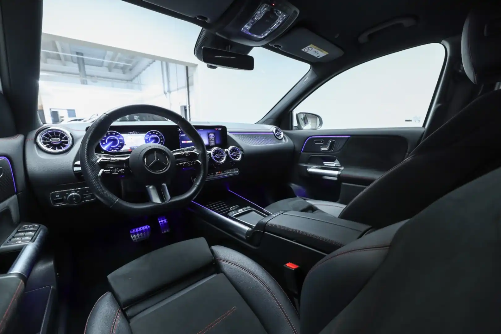 Design: Polarhvid, AMG Designlinje, 18" AMG letmetalfælge i 5-eget design, ARTICO kunstlæder/MICROCUT mikrofiber sort, Taghimmel sort, Fladbundet multifunktionssportsrat i nappalæder, AMG bundmåtter, Interiørliste med stjernemønster belyst, Interiørlister med belysning, Varmeisolerende og mørktonede ruder, Ambiente belysning (64 farver), Tagræling i poleret aluminium, Belyste trinlister med logo,