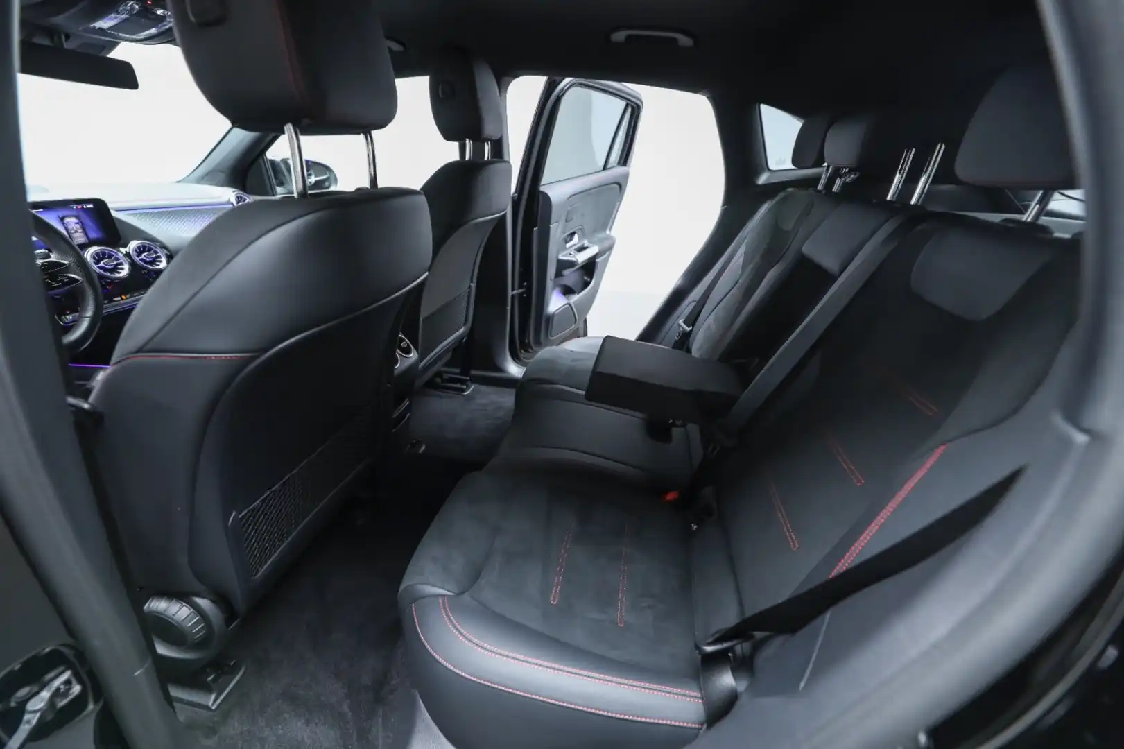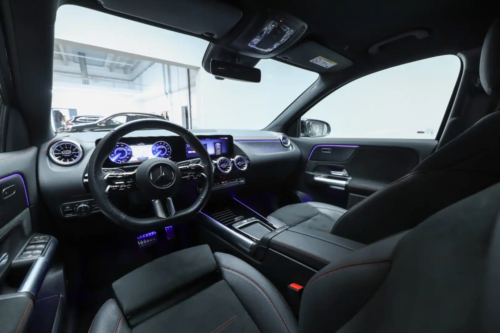 Design: Natsort, AMG Designlinje, 18" AMG letmetalfælge i 5-eget design, ARTICO kunstlæder/MICROCUT mikrofiber sort, Taghimmel sort, Fladbundet multifunktionssportsrat i nappalæder, AMG bundmåtter, Interiørliste med stjernemønster belyst, Interiørlister med belysning, Varmeisolerende og mørktonede ruder, Ambiente belysning (64 farver), Tagræling i poleret aluminium, Belyste trinlister med logo,