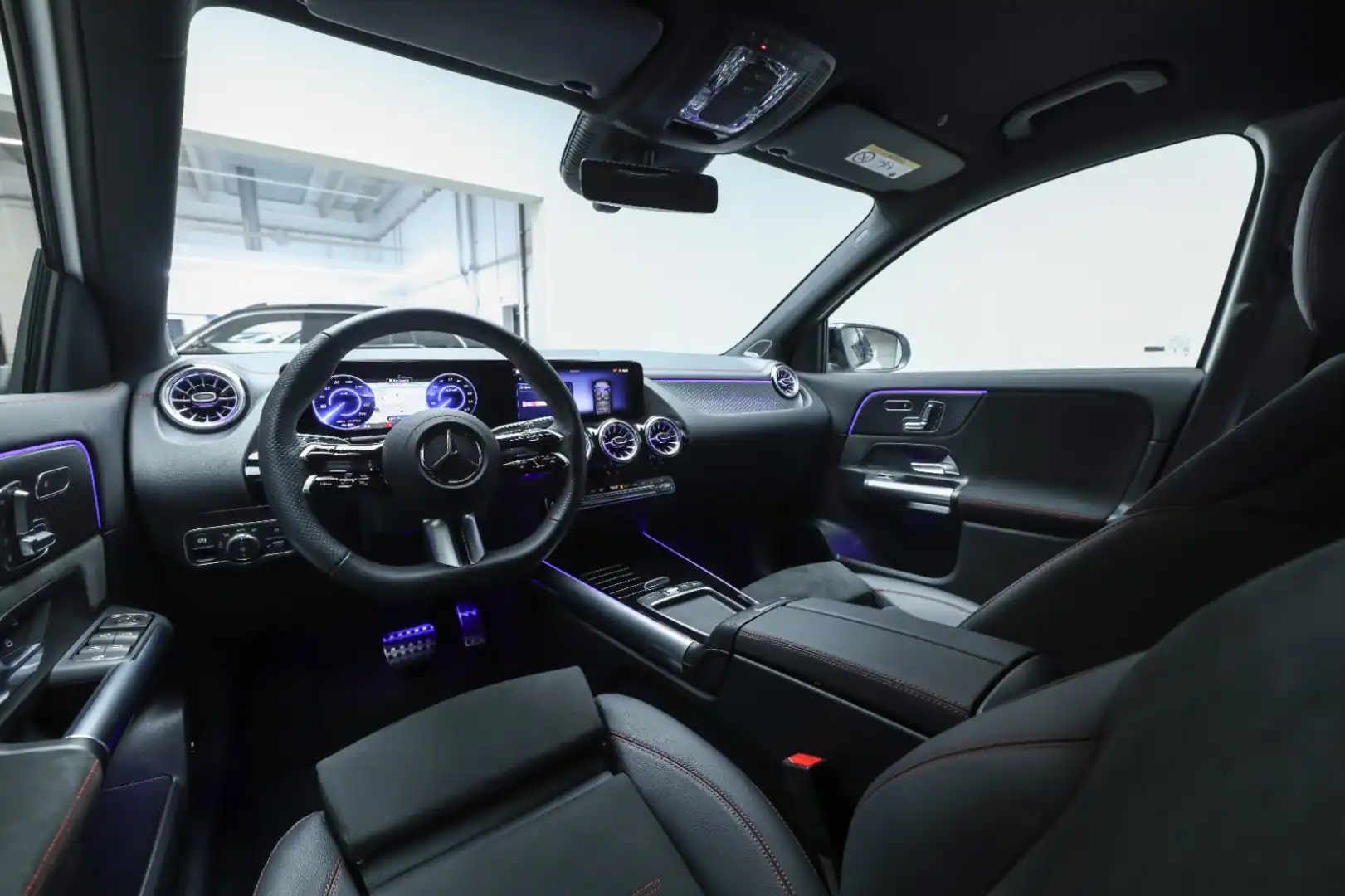 Design: Polarhvid, AMG Designlinje, Nightpakke, 18" AMG letmetalfælge i 5-eget design, ARTICO kunstlæder/MICROCUT mikrofiber sort, Taghimmel sort, Fladbundet multifunktionssportsrat i nappalæder, AMG bundmåtter, Interiørliste med stjernemønster belyst, Interiørlister med belysning, Varmeisolerende og mørktonede ruder, Ambiente belysning (64 farver), Tagræling i sort, Projektion af logo, Belyste trinlister med logo,
