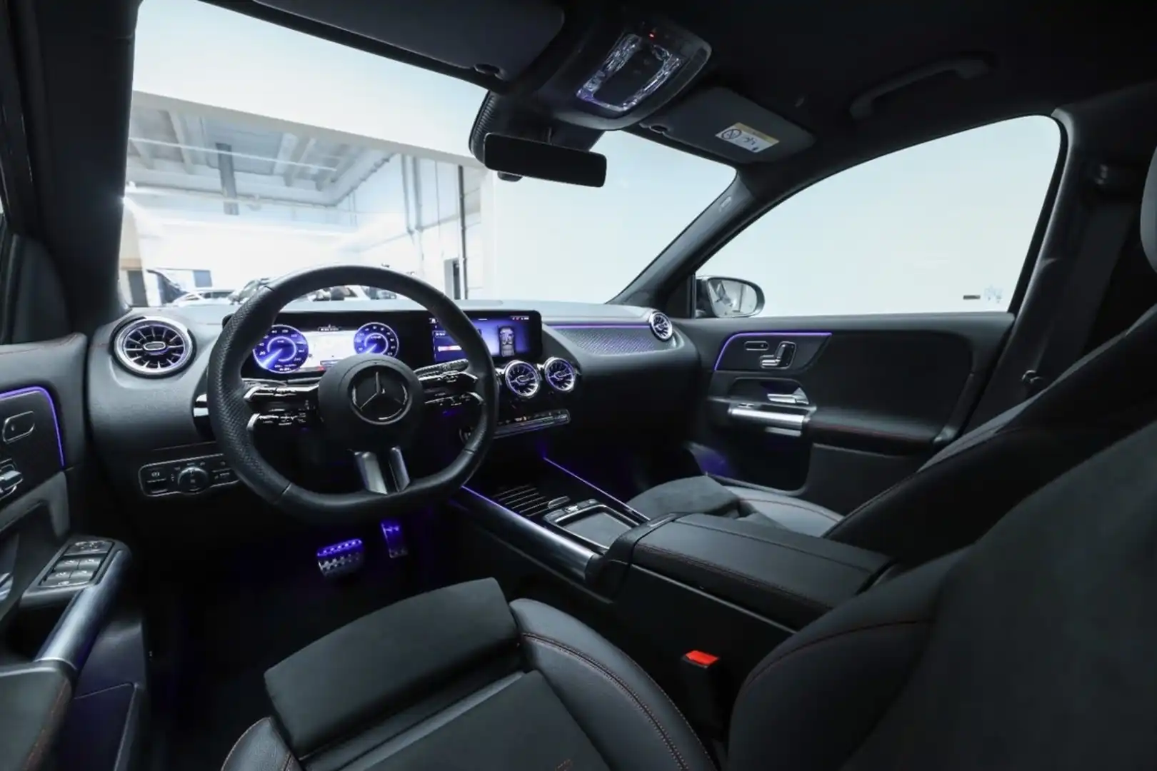 Design: Natsort, AMG Designlinje, Nightpakke, 18" AMG letmetalfælge i 5-eget design, ARTICO kunstlæder/MICROCUT mikrofiber sort, Taghimmel sort, Fladbundet multifunktionssportsrat i nappalæder, AMG bundmåtter, Interiørliste med stjernemønster belyst, Interiørlister med belysning, Varmeisolerende og mørktonede ruder, Ambiente belysning (64 farver), Tagræling i sort, Belyste trinlister med logo,