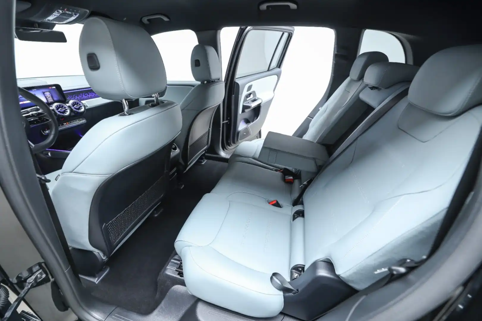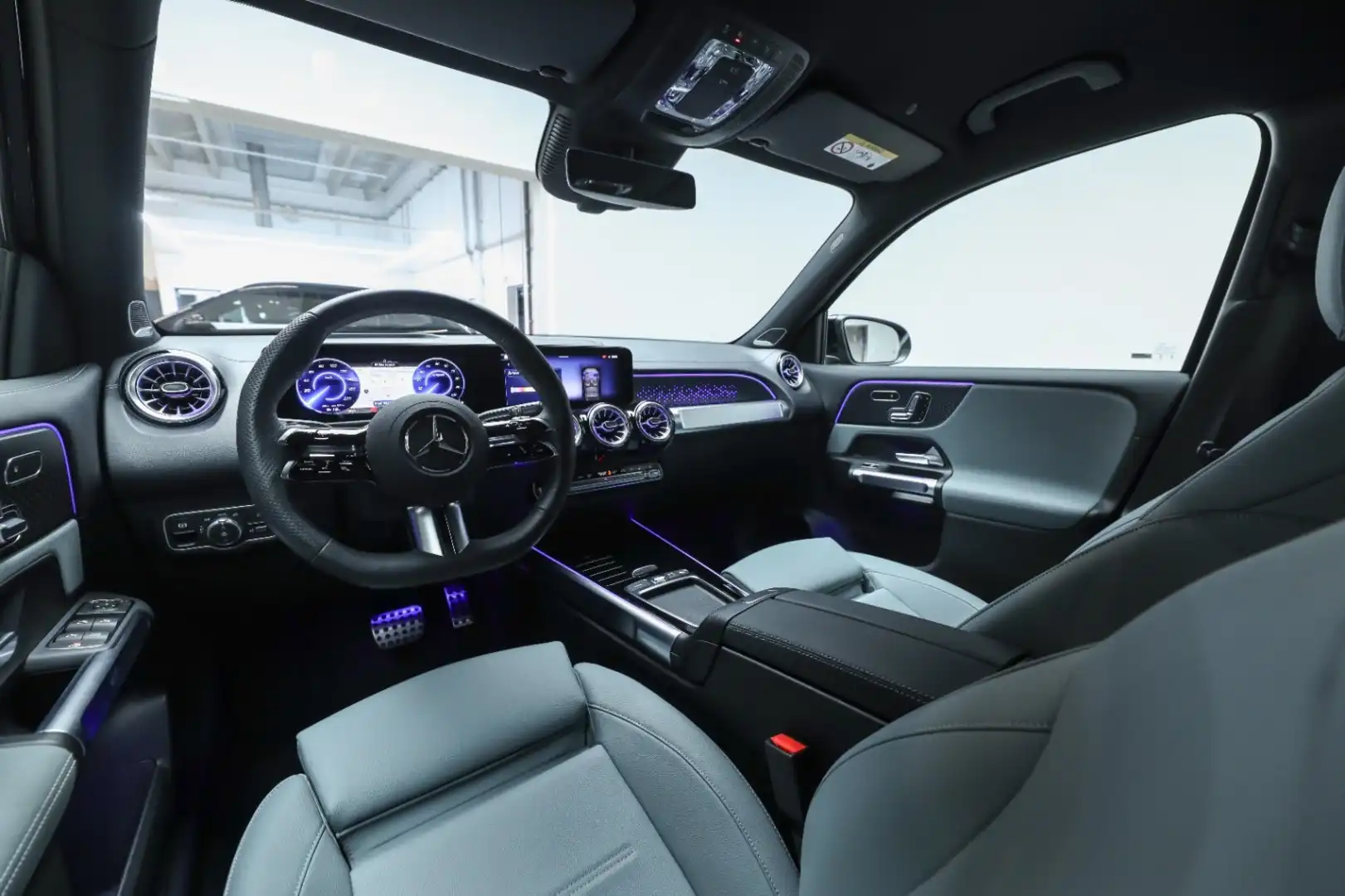 Design: Natsort, AMG Designlinje, Nightpakke, 18" AMG letmetalfælge i 5-eget design, ARTICO kunstlæder grågrøn/sort, Taghimmel sort, Fladbundet multifunktionssportsrat i nappalæder, AMG bundmåtter, Interiørliste med stjernemønster belyst, Interiørlister med belysning, Varmeisolerende og mørktonede ruder, Ambiente belysning (64 farver), Tagræling i sort, Projektion af logo, Belyste trinlister med logo,
