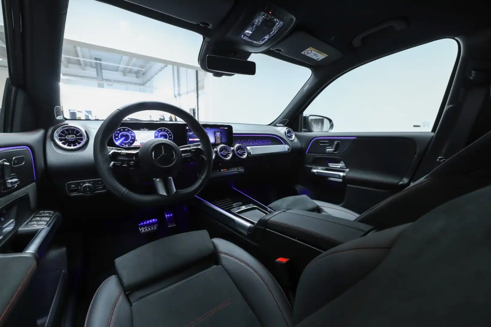 Design: Cosmossort metallak, AMG Designlinje, Nightpakke, 18" AMG letmetalfælge i 5-eget design, ARTICO kunstlæder/DINAMICA mikrofiber sort, Taghimmel sort, Fladbundet multifunktionssportsrat i nappalæder, AMG bundmåtter, Interiørliste med stjernemønster belyst, Interiørlister med belysning, Varmeisolerende og mørktonede ruder, Ambiente belysning (64 farver), Tagræling i sort, Projektion af logo, Belyste trinlister med logo,